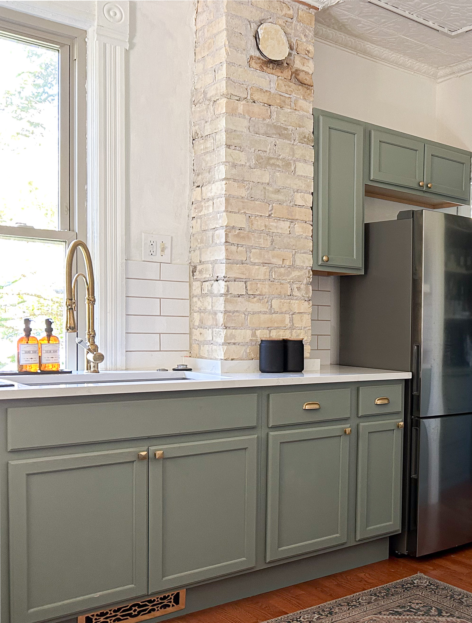 The Soft Green Cabinets: I can’t even count how many compliments I’ve gotten on this color. It’s the kind of green that changes with the light—sometimes warm, sometimes cool, always cozy. I chose it as a nod to the many greens this kitchen has seen over the years, and I love that it keeps a little bit of the home’s layered history alive. It feels both fresh and familiar, and it’s one of the things that makes the space feel truly mine.