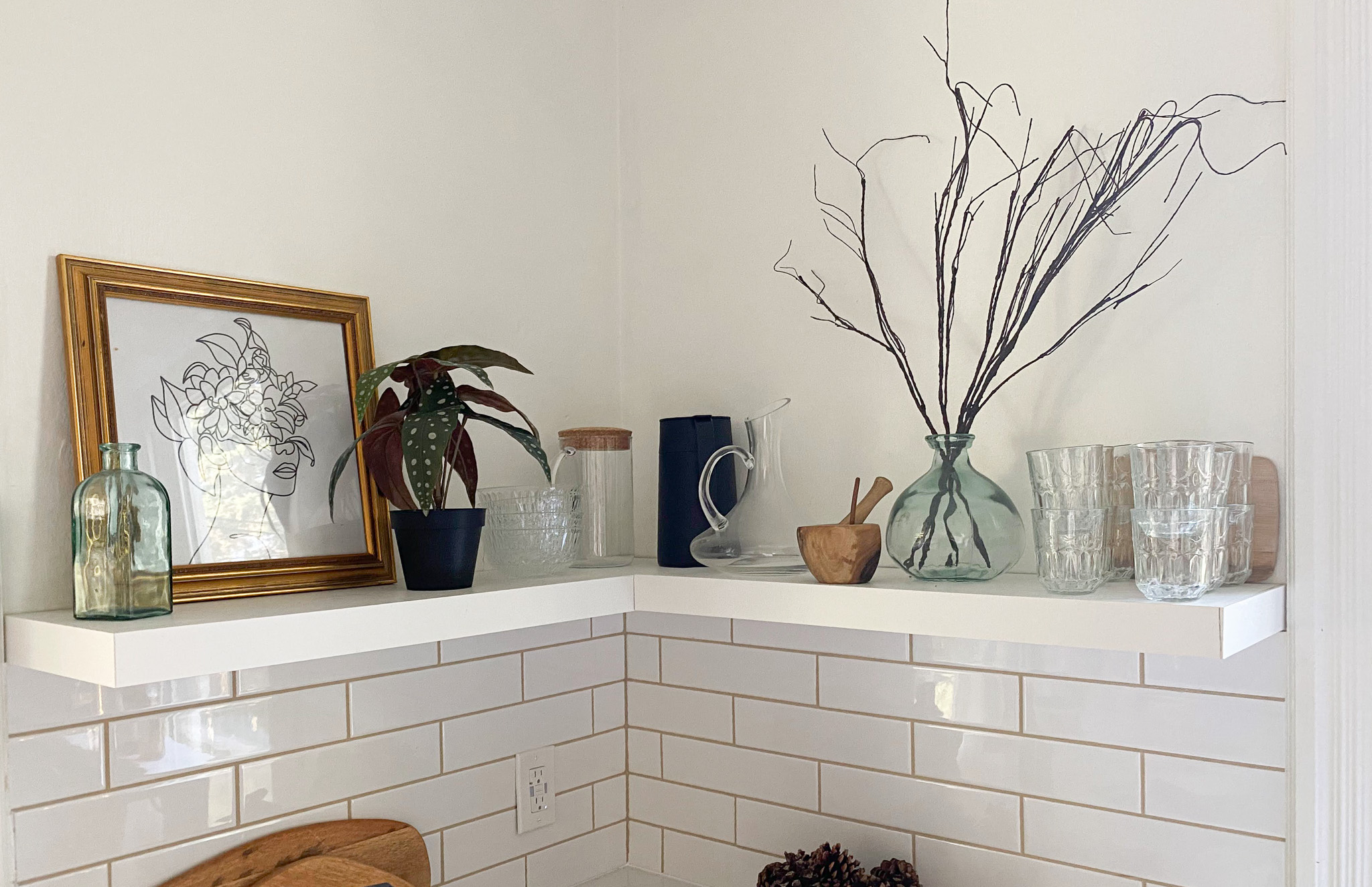 I chose a classic white subway tile backsplash to keep things feeling clean and open. It’s timeless, easy to live with, and plays nicely with the age of the home. I also added open shelving for two reasons: